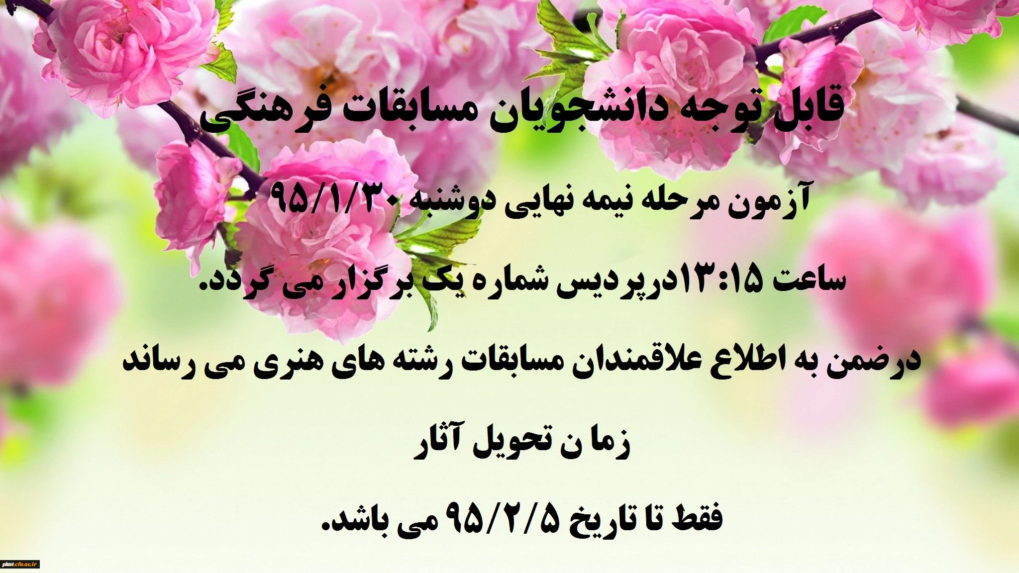 قابل توجه دانشجویان مسابقات فرهنگی آزمون مرحله نیمه نهایی دوشنبه 95/1/30 ساعت 13:15َ درپردیس شماره یک برگزار می گردد. در ضمن به اطلاع علاقمندان مسابقات رشته های هنری می رساند زما ن تحویل آثار فقط تا تاریخ 5/2/5 9می باشد. 2