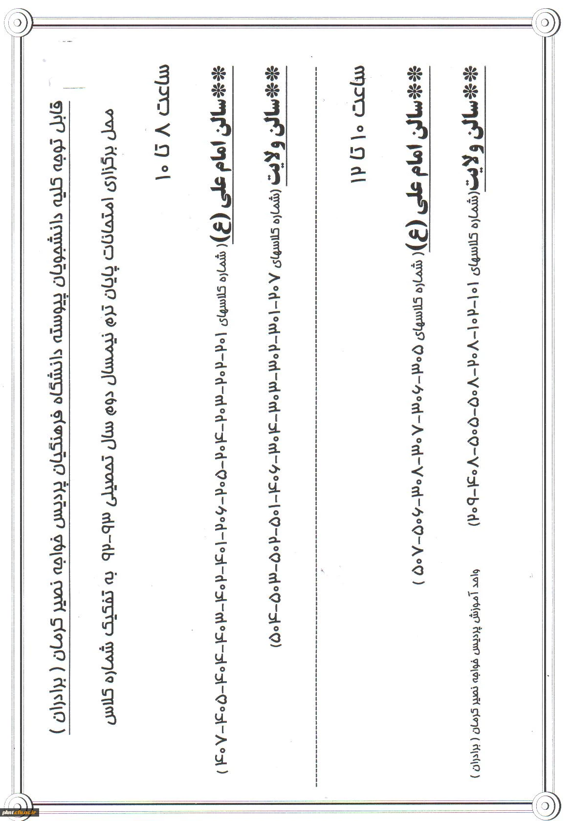 محل برگزاری امتحان به تفکیک شماره کلاس