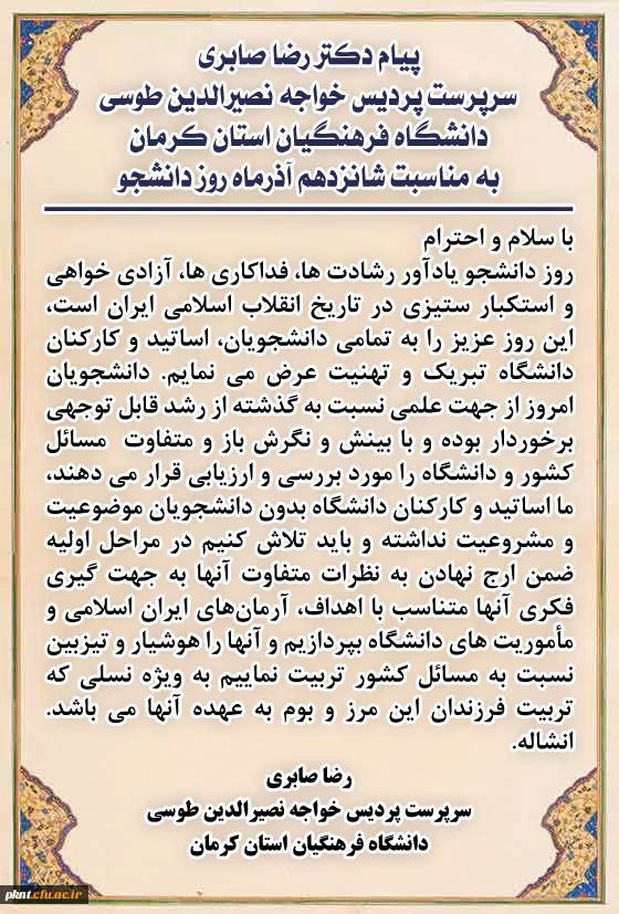 پیام دکتر رضا صابری سرپرست پردیس خواجه نصیرالدین طوسی دانشگاه فرهنگیان استان کرمان به مناسبت شانزدهم آذرماه روز دانشجو