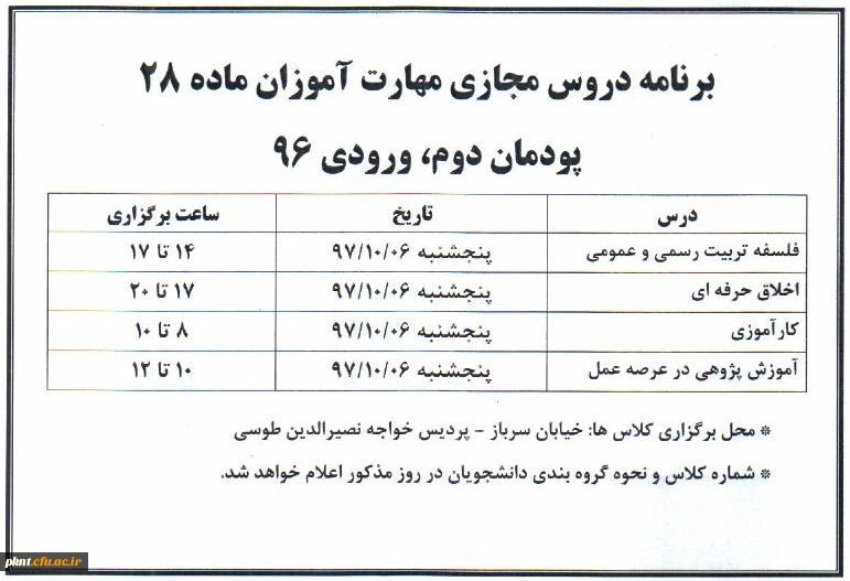 برنامه دروس مجازی مهارت آموزان ماده 28 پودمان دوم، ورودی 96