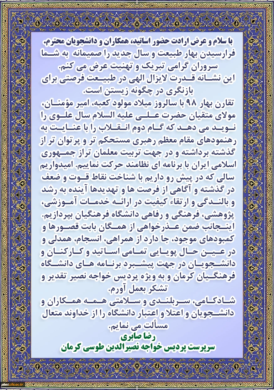 پیام تبریک دکتر رضا صابری، سرپرست پردیس خواجه نصیرالدین طوسی به مناسبت آغاز سال 1398