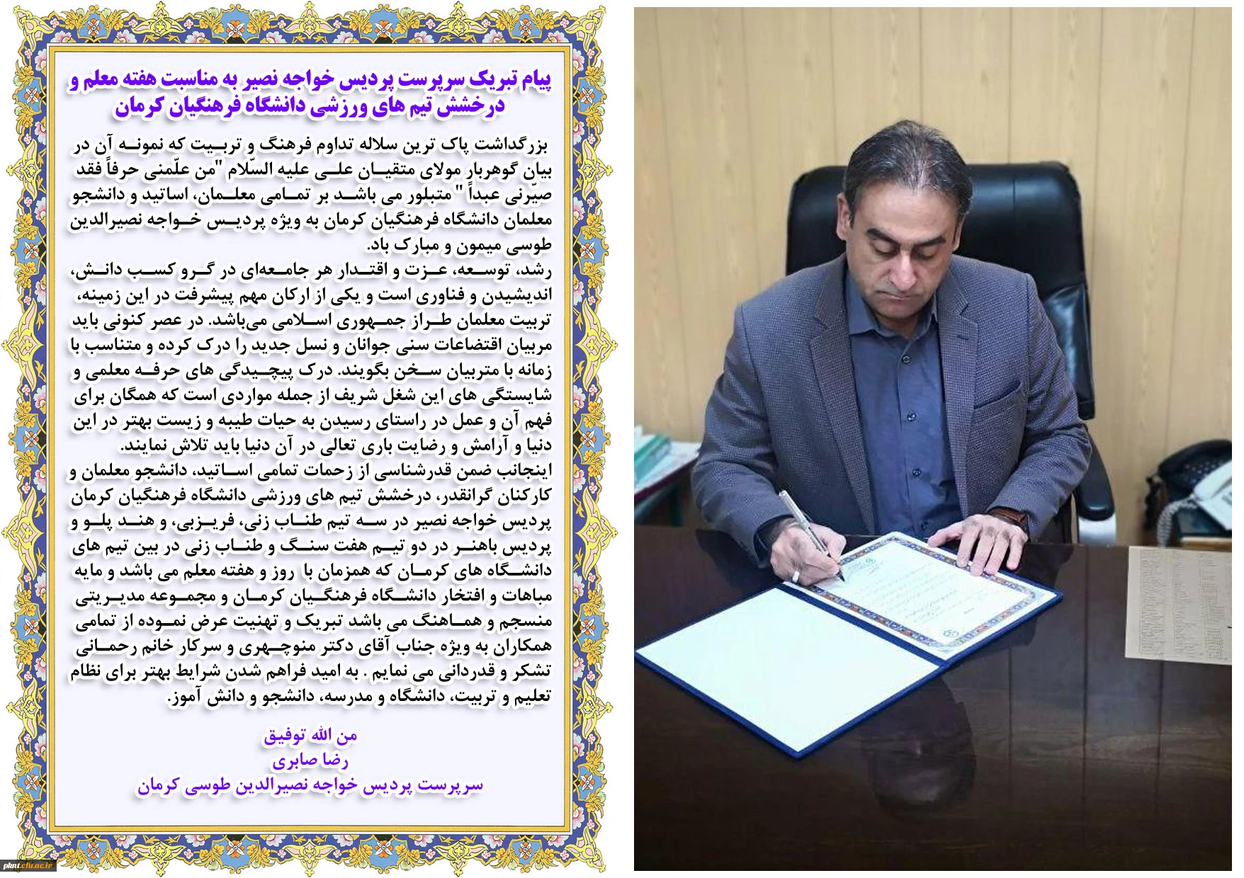 پیام تبریک سرپرست پردیس خواجه نصیر به مناسبت هفته معلم و درخشش تیم های ورزشی دانشگاه فرهنگیان کرمان